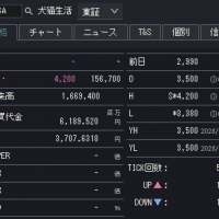 | 4/23 4/8~4/14 | 556A 犬猫生活 | 東G SBI | 2,990円 21.0億 | 2,990円 2,790~2,990円 | C |