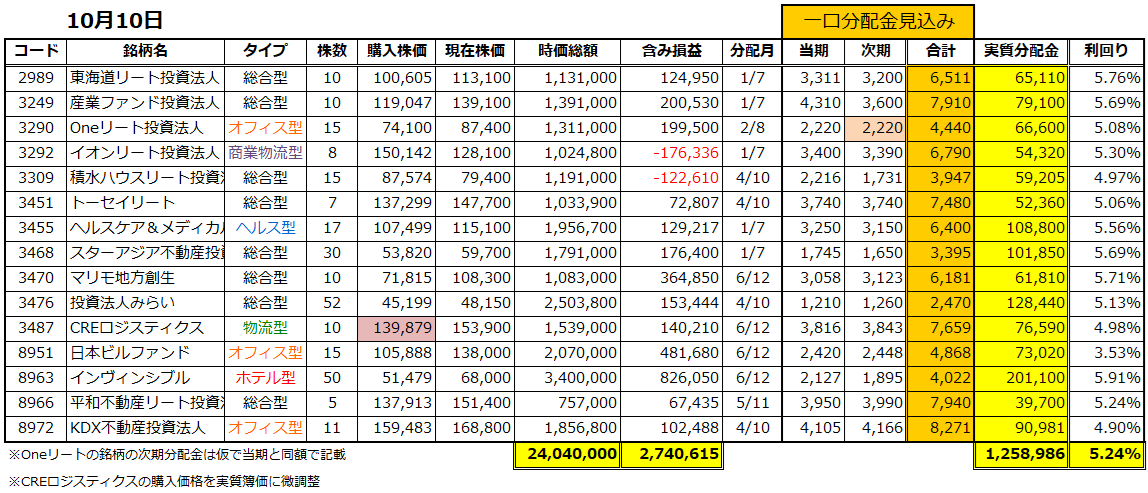 現時点での保有リート株の含み益は約274万円で、分配金利回りは約5.24%となっています。(全リート平均は約4.62%)