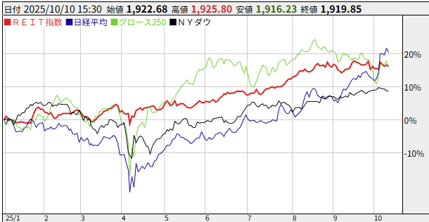 昨年末比でリート指数は+16.1%、グロース250指数は+15.3%とペースが落ちる一方、日経平均株価は急騰して昨年末比+20.5%でトップに立ちました。