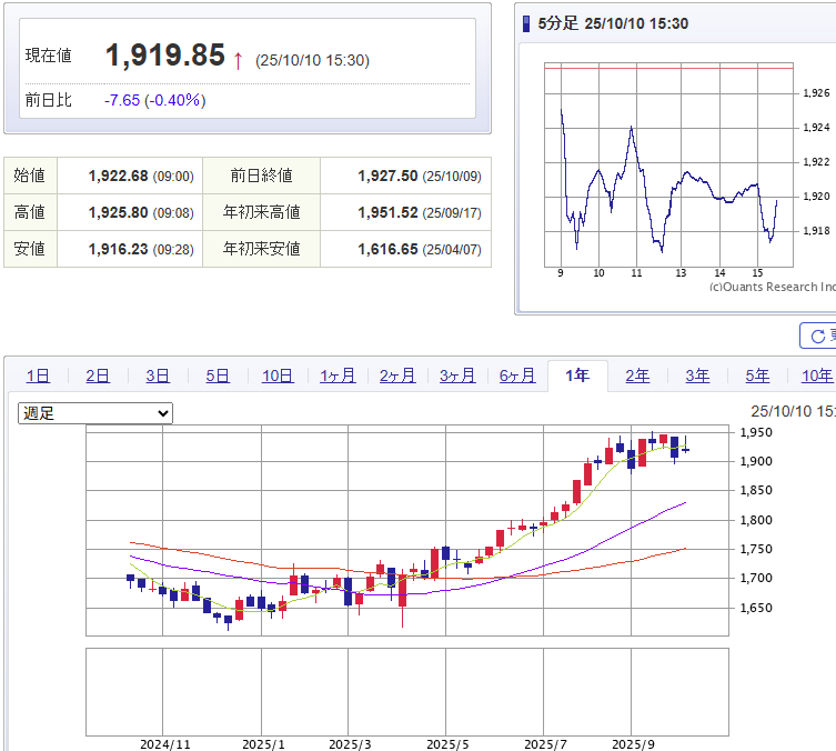 9月中旬に一瞬1,950Pを超える場面もありましたが、金利先高観もあってか流石に上値が重くなりました。