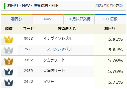 10/10(金)時点の東証リート指数は1,919.85Pとなり、前回9/12(金)の1,938.06Pから18.21P(約0.94%)下落しています。