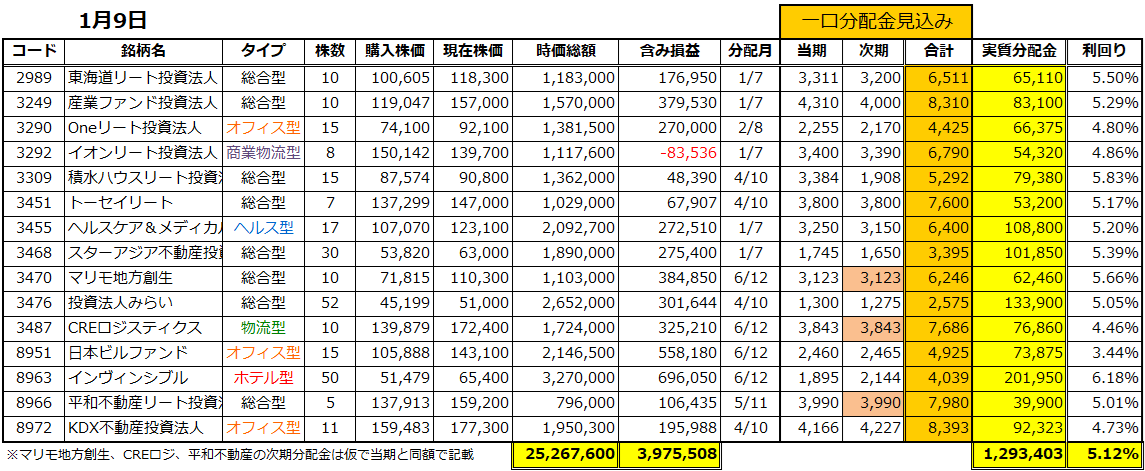 現時点での保有リート株の含み益約397万円で、分配金利回りは約5.12%となっています。(全リート平均は約4.42%)
