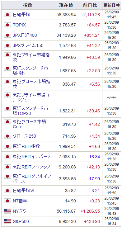 昨日の選挙結果を受けて本日の日経平均株価2,110.26円高(上昇率約3.89%)と急騰し、TOPIXと共に史上最高値を更新しています。瞬間高値は57,337.07円までありました。
