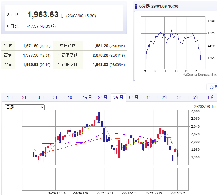 3/6(金)時点の東証リート指数1,963.63Pとなり、前回2/6(金)の1,994.83Pから31.2P(約1.56%)下落しました。