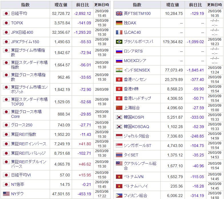 東京株式市場で日経平均は3営業日ぶりに反落し、前営業日比2892円12銭安の5万2728円72銭で取引を終えた。歴代3位の下げ幅を記録した。イラン情勢の長期化への警戒感で世界的にリスクオフの売りが広がり、一時4200円超安となった。売り一巡後は、原油価格の上昇一服などを背景に、下げ幅を縮小した。日経平均は1012円安で寄り付いた後も下げを強め、心理的節目の5万4000円、5万3000円、5万2000円を相次いで下回り、4213円安の5万1407円66銭で安値を付けた。イラン国営メディアが8日、