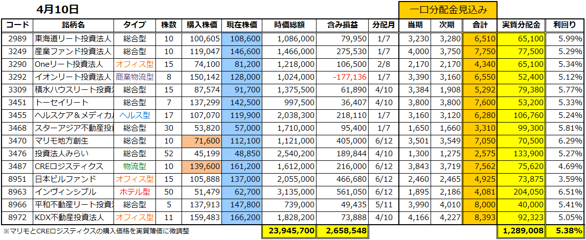 現時点での保有リート株の含み益約265万円で、分配金利回りは約5.38%となっています。(全リート平均は約4.70%)