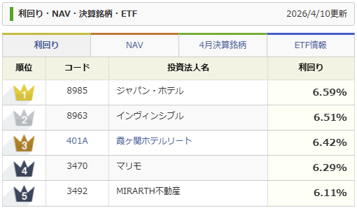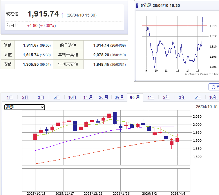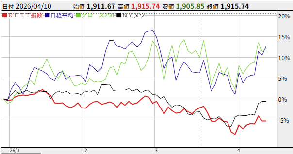 4/10(金)時点の東証リート指数1,915.74Pとなり、前回3/6(金)の1,963.63Pから47.89P(約2.44%)下落しました。