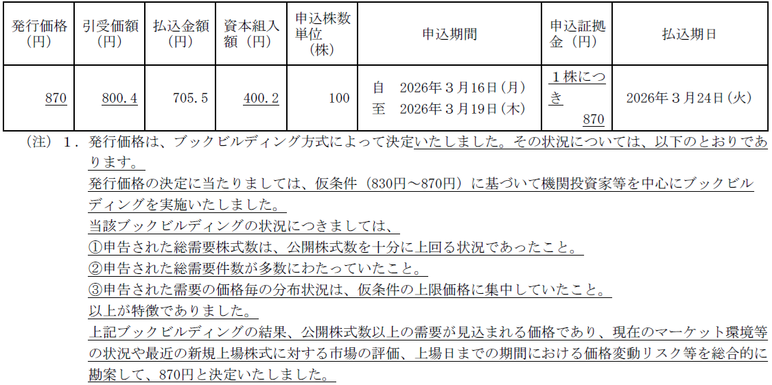 ベーシックIPOの公開価格は、仮条件830円~870円の上限価格となる870円で決定しました。