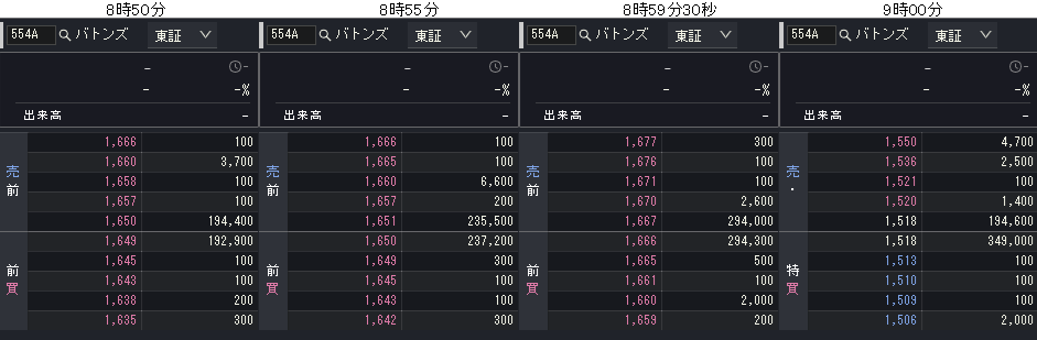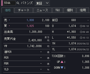バトンズは9時16分に1,674円の初値を付け、初値形成時の出来高は34.72万株、売買代金は約5.8億円でした。