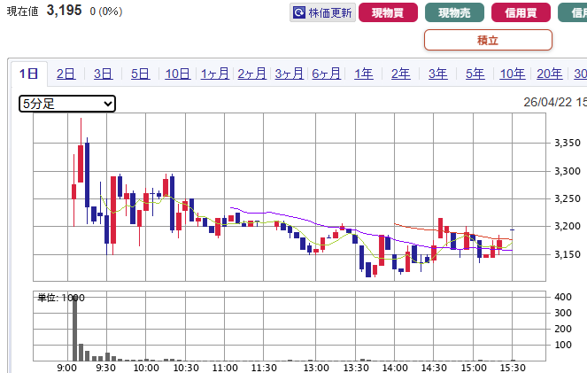 初値形成直後の揉み合う中で高値は@3,395円までありましたが、その後は3,200円を挟む動きで推移しました。後場には初値の3,110円まで下げる場面がありましたが、最終的に一度も初値を割ることなく推移して、最後は@3,195円で引けています。