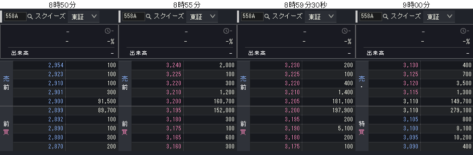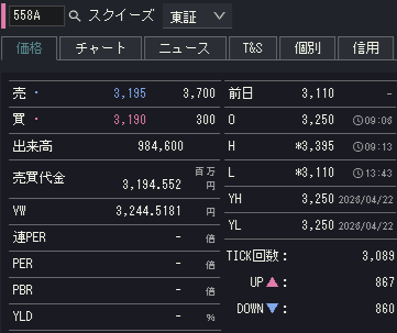 SQUEEZEは9時6分に3,250円の初値を付け、初値形成時の出来高は21.2万株、売買代金は約6.9億円でした。