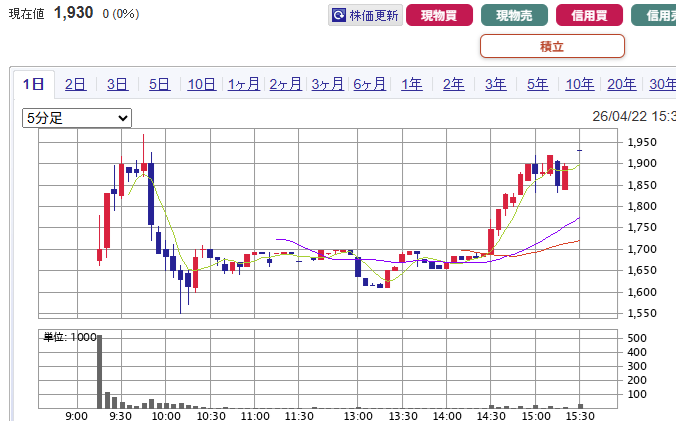 初値形成後は買い優勢の展開となり、30分後には初値を17%超上回る@1,968円の高値を付けています。その後急落して一時は初値を割り込む場面もありましたが、14時30分から再び買われて最後は後場高値の@1,930円で引けています。
