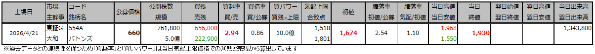 初日値付かずで持ち越しとなっていたバトンズのIPOは、公開価格660円の2.54倍となる1,674円の初値を付けました。
