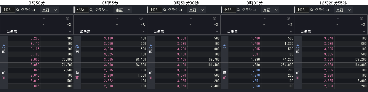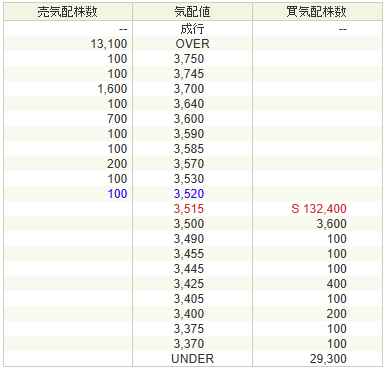 9時直前の初値合致点は3,100円前後で、9時には約21万株(売り株数の約5.7倍)の買い越しでスタートしました。また、後場寄り前の初値合致点は3,000円前後でした。