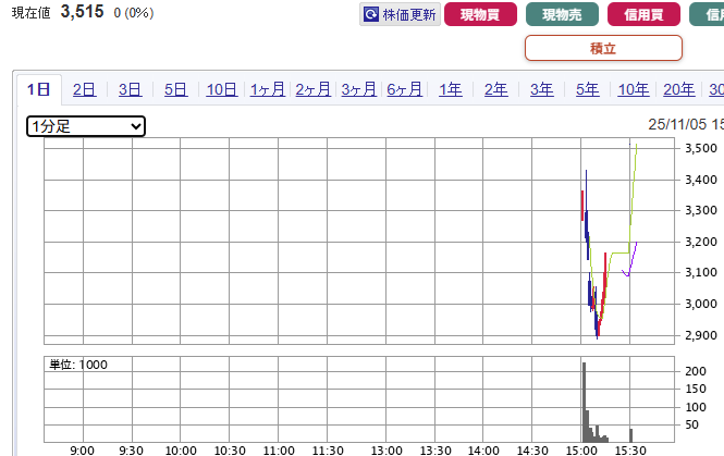 初値の数秒後には@3,365円の位置で売り優勢の特別気配となり、その後も激しい空中戦の中で売りに押されて、一時は初値から1割以上安い2,888円まで下げる場面がありました。