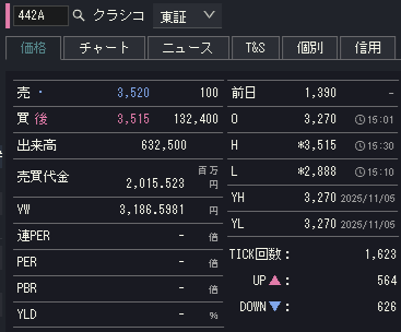 クラシコは15時1分に当日の初値形成上限となる3,270円の初値を付け、初値形成時の出来高は21.14万株、売買代金は約6.91億円でした。