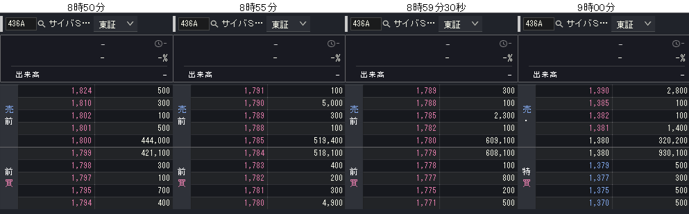 9時直前の初値合致点は1,780円前後で、9時には約61万株(売り株数の約2.9倍)の買い越しでスタートしました。