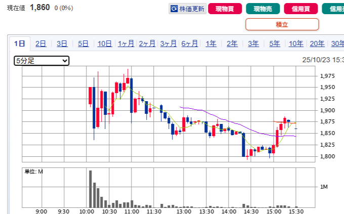 後場もそのラインを奪還できずに一時は1,800円を割れる場面もあり、最後は少し戻しましたが、初値やVWAPを上回れずに@1,860円で引けています。
