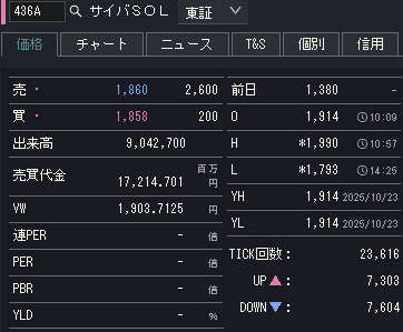 サイバーソリューションズは10時9分に1,914円の初値を付け、初値形成時の出来高は140.83万株、売買代金は約26.95億円でした。