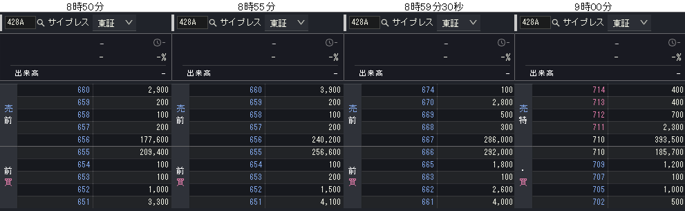 9時直前の初値合致点は666円前後で、9時には2倍超の売り越しでスタートしています。