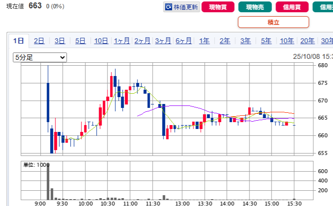 売り気配のスタートから初値形成後も売られる展開となり、655円の安値から多少戻すも上値は重く、後場も冴えずで最後は初値やVWAPを下回る663円で引けています。