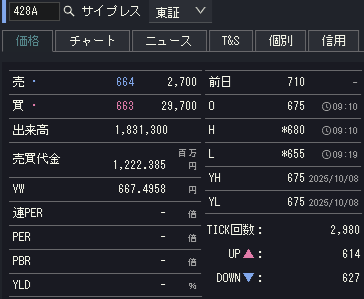 サイプレス・ホールディングスは9時10分に675円の初値を付け、初値形成時の出来高は42.55万株で売買代金は約2.9億円でした。