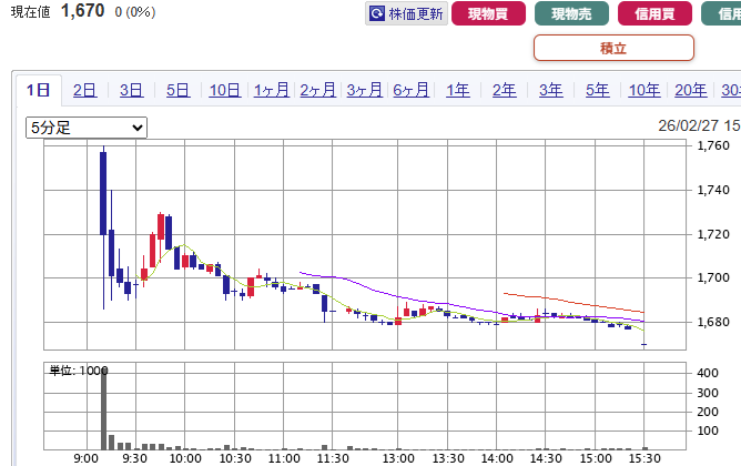 9時時点での公開価格以上の買いはわずか6.5万株(1憶円強)。これでははどうしようもないですね…。初値後も売り込まれて一度は反発しましたが買いは続かず。その後も振るわずでズルズルと下落し、後場も冴えずで最後は@1,670円の安値引けでした。