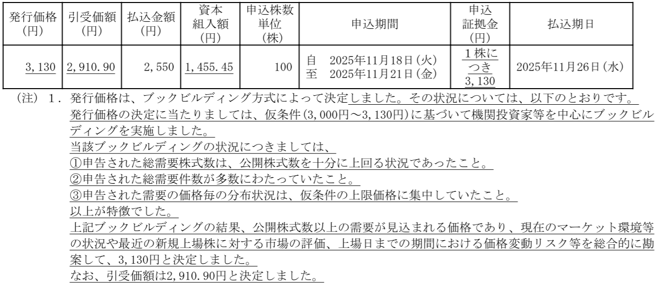 海外への販売株数は252.59万株(約79.1億円:海外比率:約38.7%)となったほか、アセットマネジメントOneが運用する7つのファンドへの親引けでの割り当て株数は、47.92万株(約15.0億円)で決定しています。