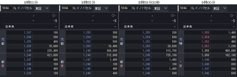 イノバセルは9時12分に1,248円の初値を付け、初値形成時の出来高は52.56万株、売買代金は約7.06億円でした。