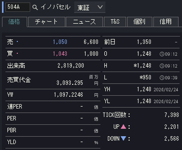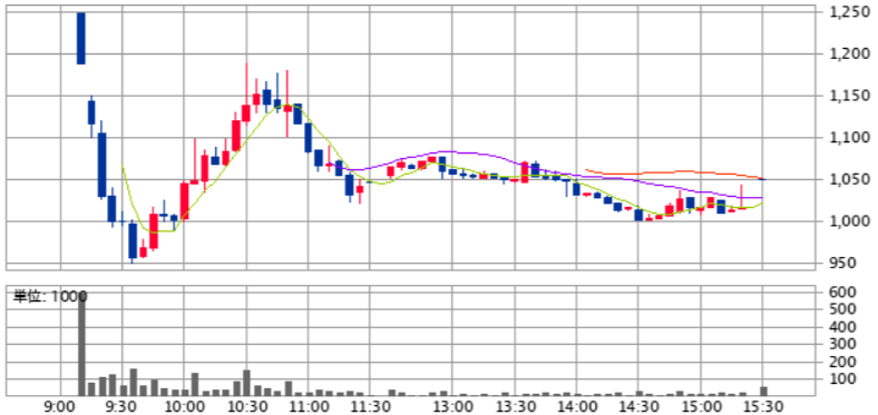 初値後も売り込まれて9時39分にはストップ安目前となる@950円の安値を付けています。その後は徐々に買い戻され10時半過ぎには1,150円を超えるところまで上昇しましたが、上値は重く再び下落してしまい、後場も良いところなしで最後は1,050円で引けています。