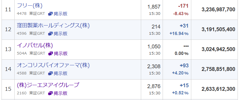 売買代金は東証グロース市場で13位、全市場では330位でした。