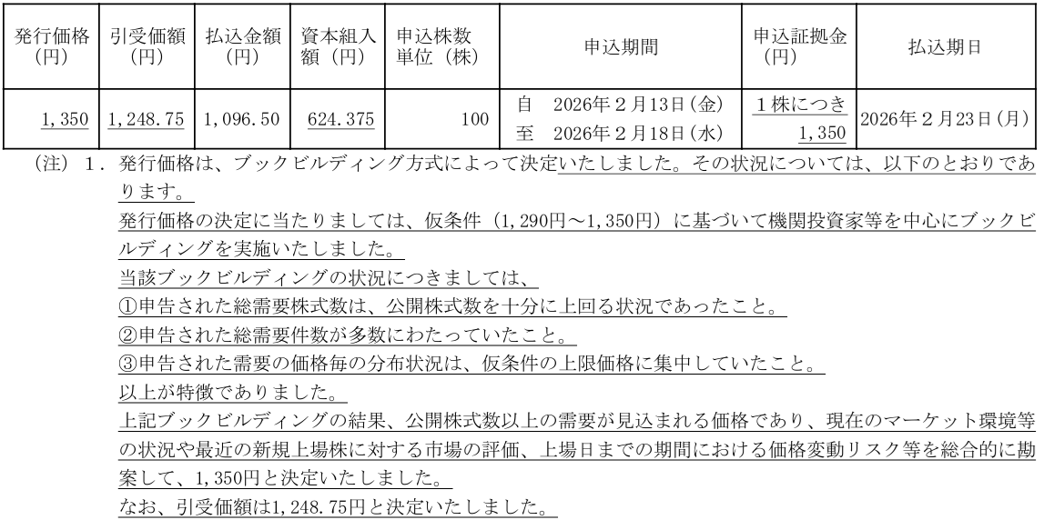 海外への販売株数は公募分と売出し分で計411.83万株(約55.6億円)となり(海外販売比率約39.24%)、アルフレッサとファンド3社に対する親引けの割当は合計で55.54万株(約7.5億円)で決定しています。