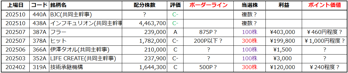 注目すべきは、SBI証券の配分株数が少ない時は複数当選が200株になっている点です。また、事前評価とボーダーラインの相関は見て取れますが、ポイント価値は初値次第で大きく左右されます。