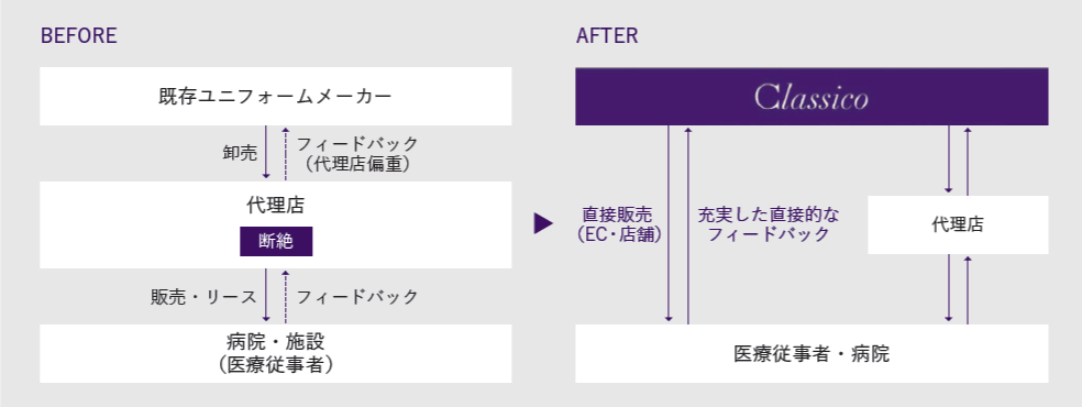 クラシコは、医療現場で働く医師や看護師などの医療従事者向けに、白衣やスクラブ(上下別れた医療ウエア)等のメディカルアパレル商品を企画・開発・販売しており、入院患者向けの患者衣等も手掛けています。