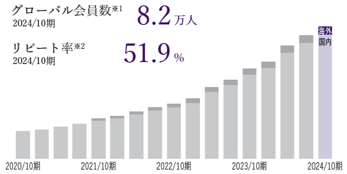 クラシコのグローバル会員数(公式オンラインストアの会員数)は、2024年10月期末時点で8.2万人と年々拡大しており、顧客リピート率は51.9%となってます。
