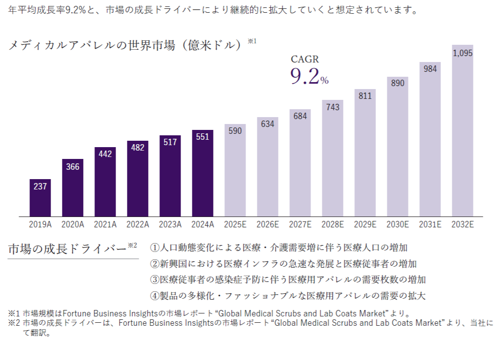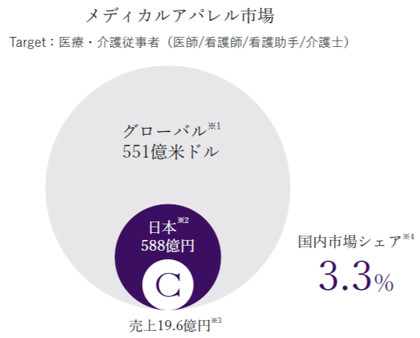 メディカルアパレル市場は構造的に継続的な成長市場であり、同社のシェアはまだ3.3%と低いことから、国内・グローバルともに開拓余地は大きい状況です。