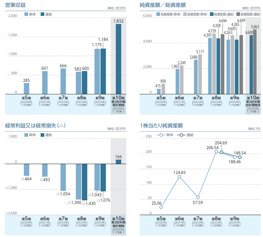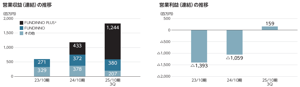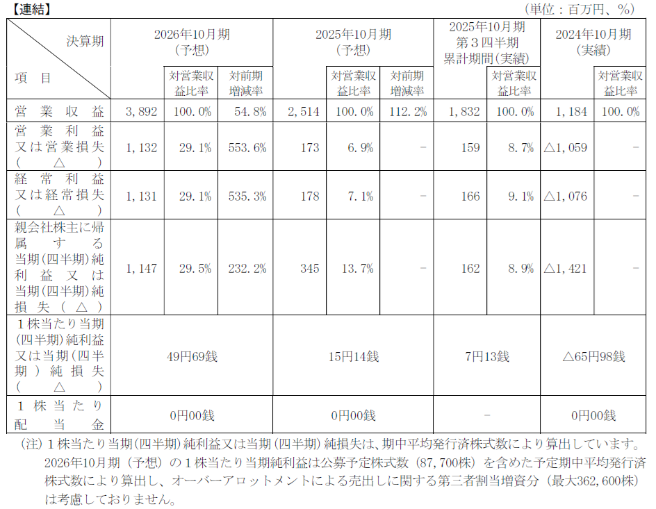FUNDINNOの業績は2025年10月期にようやく黒転する水準ですが、2026年10月期は約5割の増収で約6.5倍の増益と非常に強気な見通しとなっています。