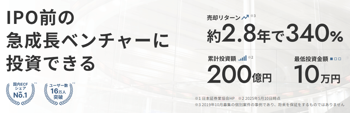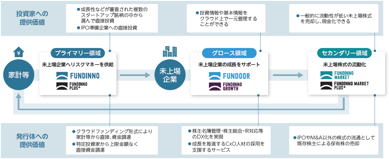 事業的には、投資家からスタートアップへの資金供給/スタートアップの資金調達サービスを提供する「プライマリー領域」、スタートアップ企業の成長段階で成長をサポートする「グロース領域」、スタートアップ企業へ投資した株主の投資回収機会を提供する「セカンダリー領域」の構成で、未上場企業エクイティープラットフォーム事業を展開しています。