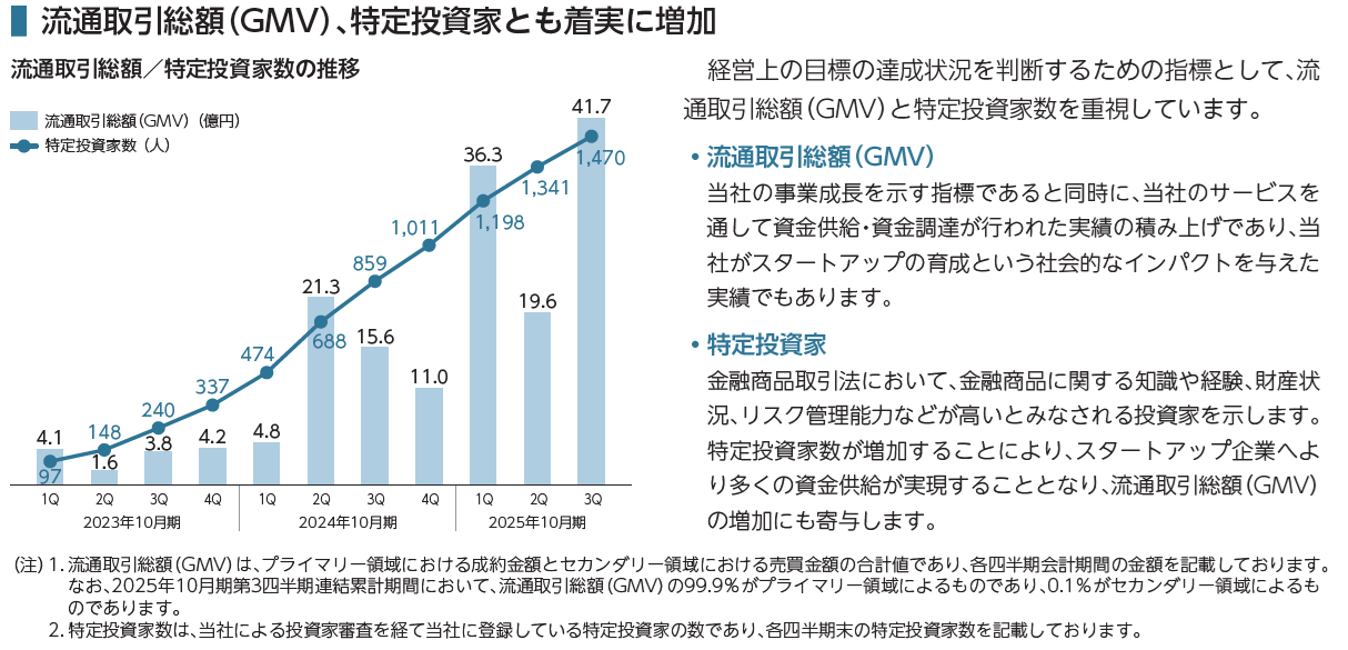 同社の2025年10月期における営業収益の約88.7%はプライマリー領域で、主にスタートアップ企業のプラットフォーム上で行った資金調達時の成約手数料であり、流通取引総額(GMV)にテイクグレードを乗じて算出されます。