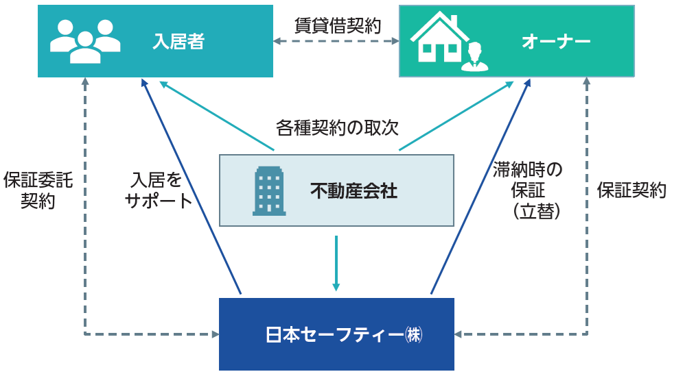 NSグループが展開する家賃債務保証サービスとは、日本セーフティーが入居者の連帯保証人になり、家賃等の保証を約束するサービスです。入居者が賃借料を支払わなかった場合には日本セーフティーが代位弁済し、入居者から賃借料を回収する仕組みで、入居者からは最初に保証委託料を受領します。