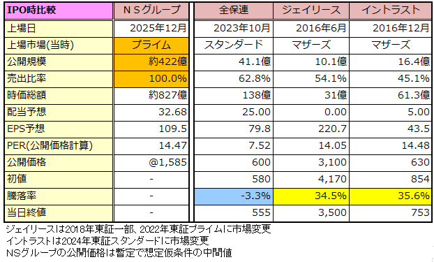 今回のNSグループのIPOはファンドの出口案件(100%)で公開規模も大きく、幅を持たせた想定仮条件の設定でレンジ幅も広いことから、できるだけ高く売りたい売出人の意向も垣間見えます。