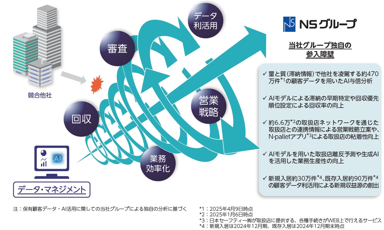 NSグループでは、競合他社には獲得困難な滞納情報や取扱店との連係情報等、豊富なデータを蓄積しています。これらのデーターをインプットしたAIモデルを各種業務に活用することでオペレーションを高度化し、模倣困難な競争優位性を築いています。