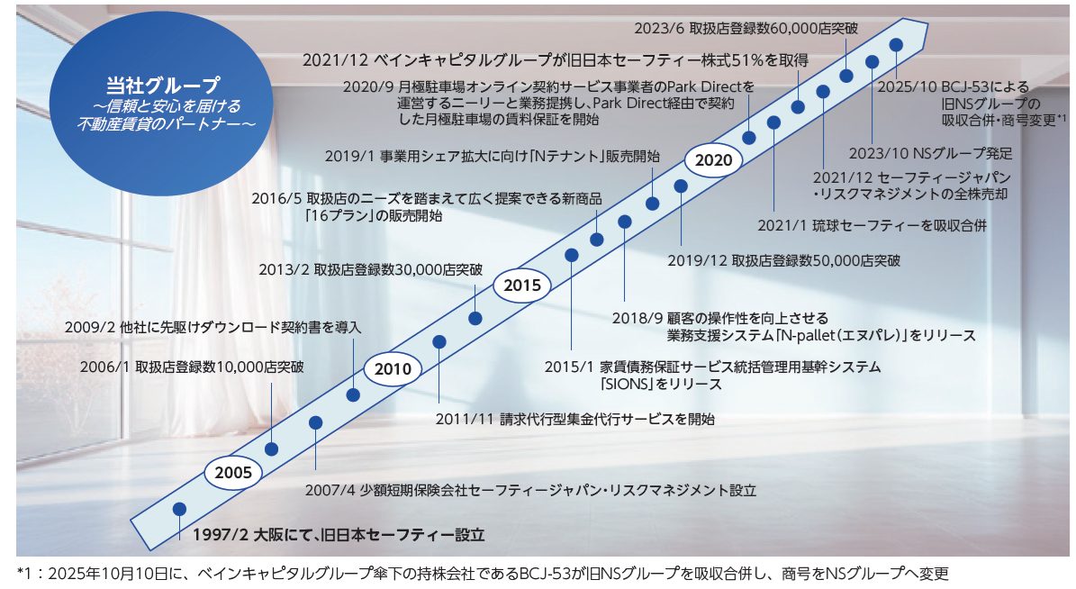 当グループは1997年の設立から一貫して家賃債務保証事業を展開しており、2023年には取扱登録者数が6万店を突破しました。2021年にはベインキャピタルの資本参加を受け、事業を拡大しています。