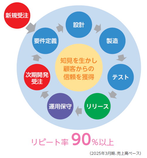 また、当社グループは大手顧客と厚い信頼関係を築き継続的な案件をじゅちゅうすることで、安定かつ高利益をもたらすリピート受注で90%以上のリピート率を実現しています。