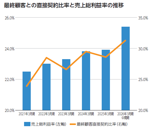 公共分野の入札案件や大規模開発案件は大手ITベンダーや大手SIerが一次請となるケースが多く、主要顧客である富士通のコアパートナー認定や、TISの組織戦略パートナー認定を受けており、継続的かつ安定的な取引を行っています。一方、利益率の高い最終顧客との直接契約比率は近年上昇傾向にあり、2026年3月期中間期には約31.3%となっています。