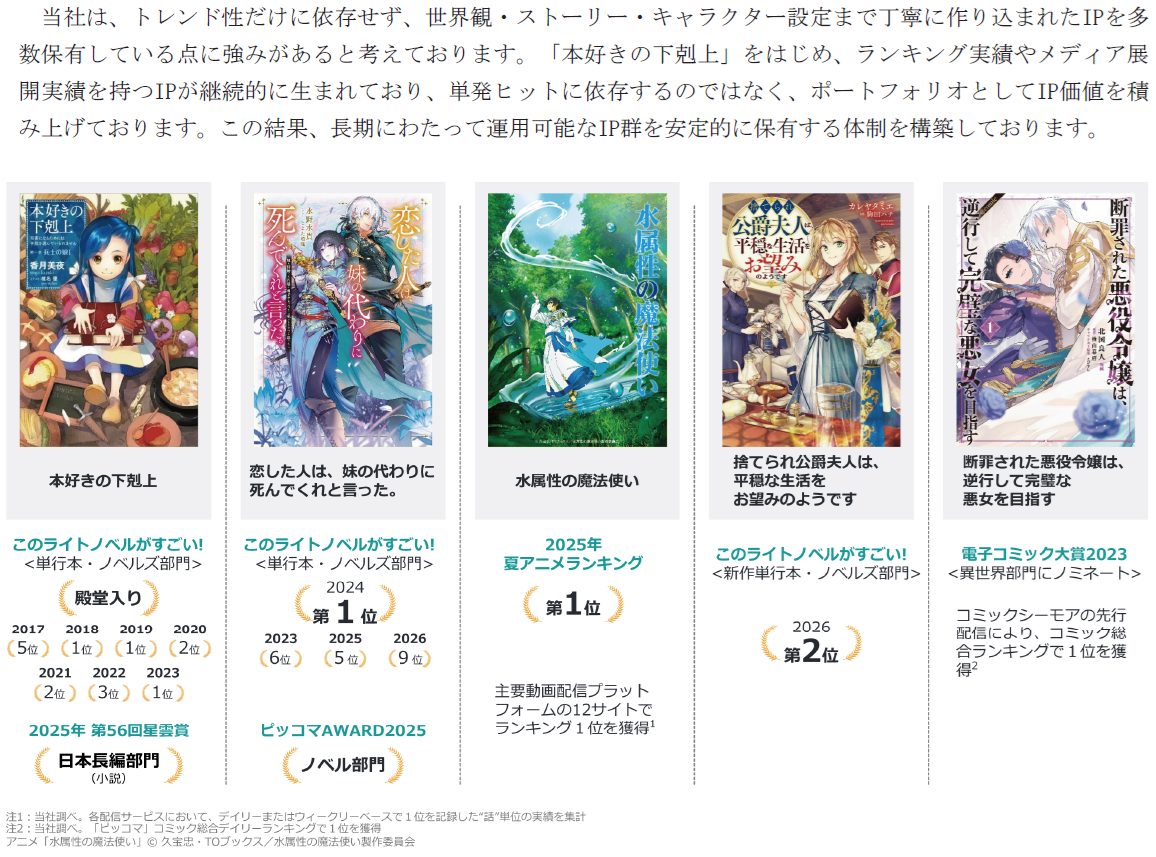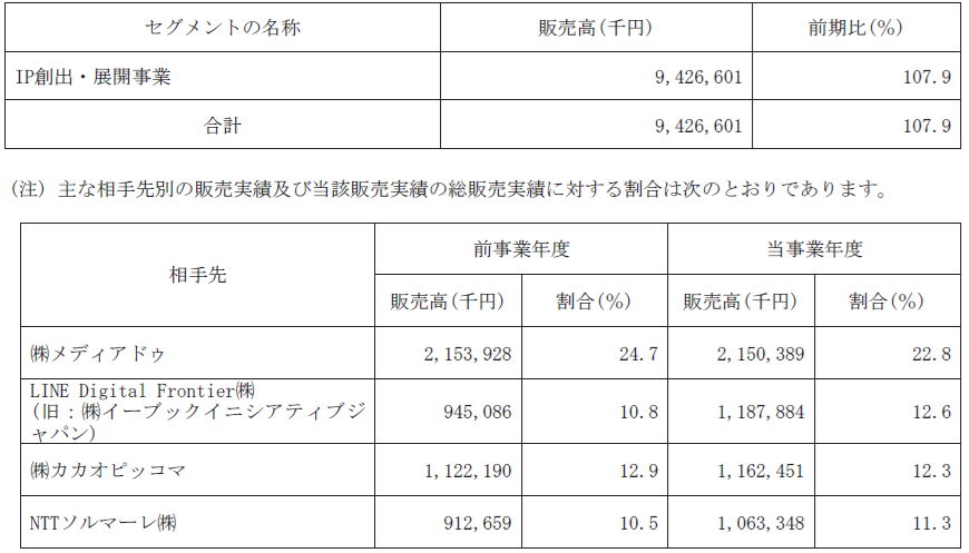 2026年4月中間期の売上高構成比は、紙書籍が約9.6%、電子書籍が約81.1%、その他が約9.3%となっており、2025年4月期の主な販売先は、メディアドゥが約22.8%、LINE Digital Frontier(旧イーブックイニシアティブジャパン)が約12.6%、カカオピッコマが約12.3%、NTTソルマーレが約11.3%となっています。