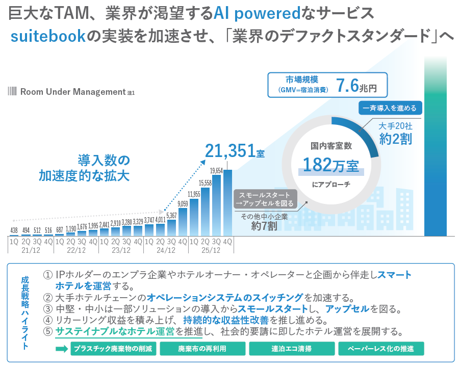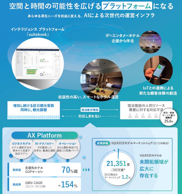 SQUEEZEは、ホテルの宿泊管理システムであるAXプラットフォーム「suitebook」と自社のスマートホテル運営で業績を急拡大させています。