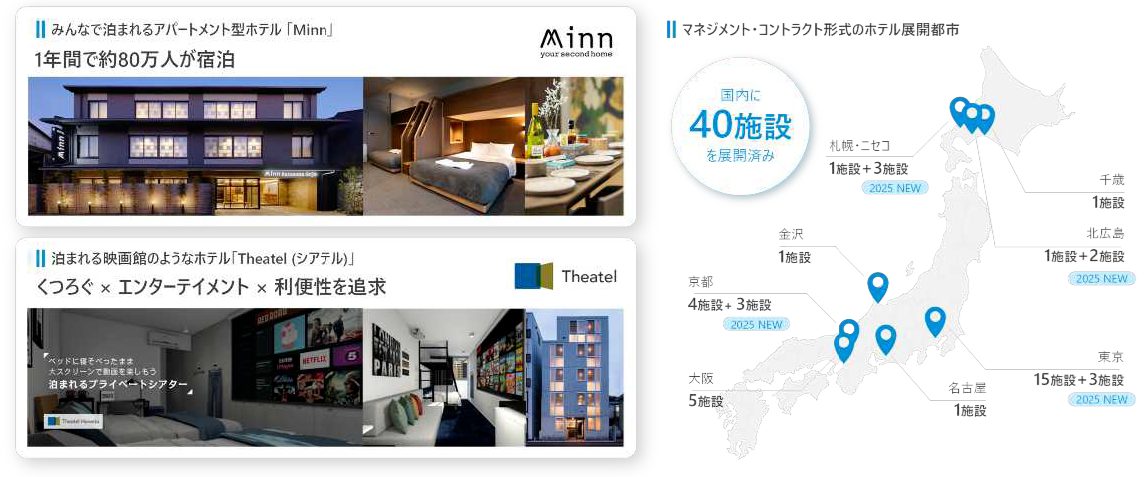 また、SQUEEZEは「Minn」や「Theatel」など自社ブランドのスマートホテルを本州や北海道で展開しています。
