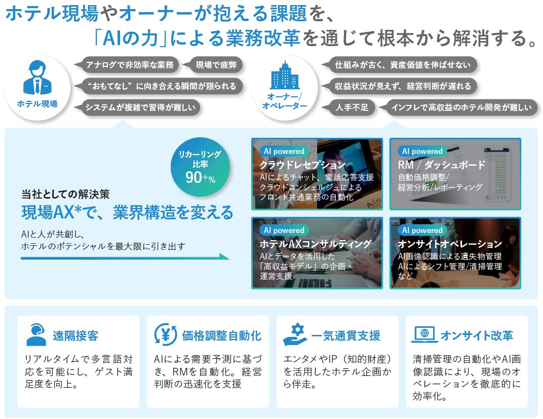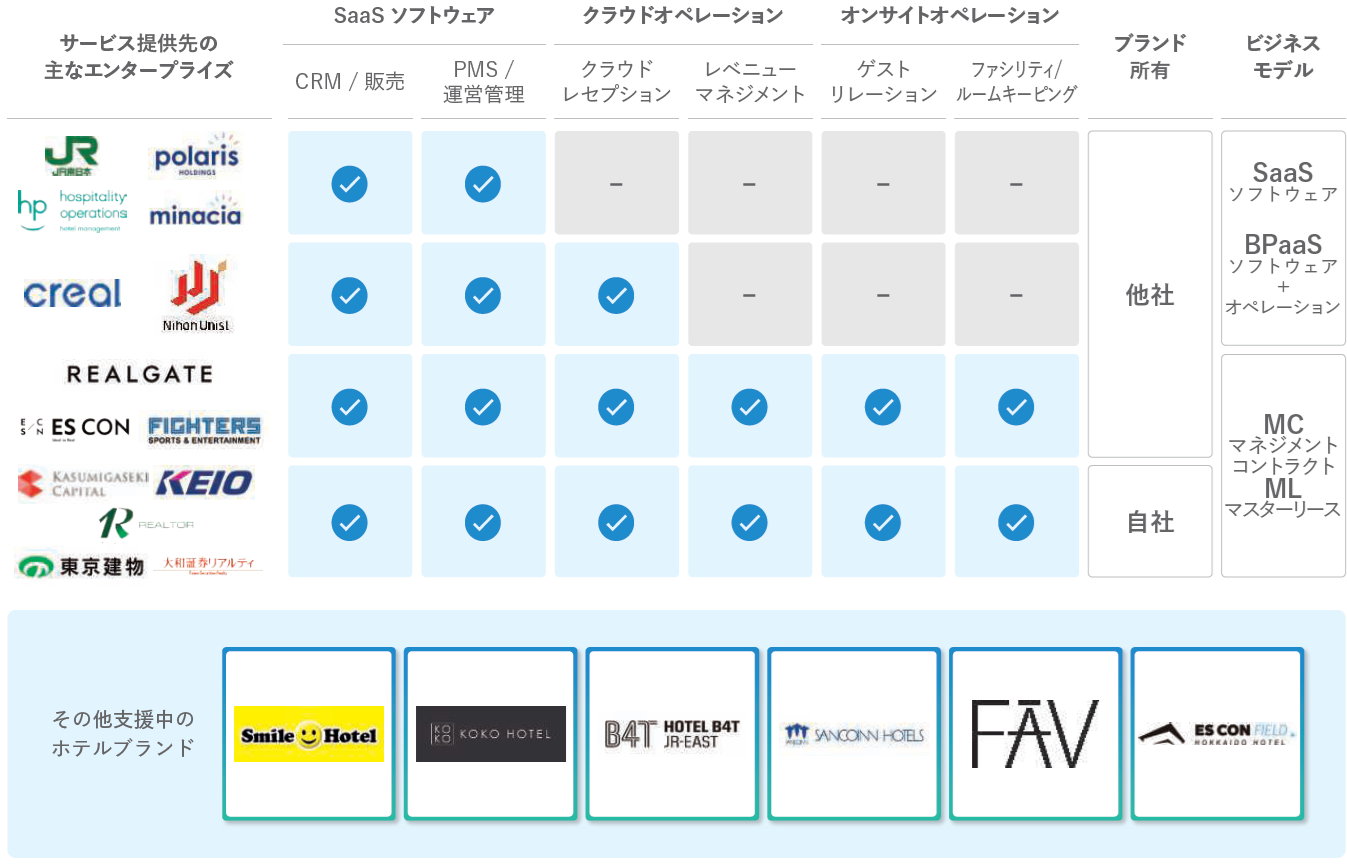 SQUEEZEは、宿泊施設運営のバリューチェーン全体を対象として、SaaS、クラウドオペレーション、オンサイトオペレーションを組み合わせた多様なサービスを提供しています。