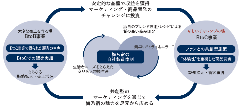 梅乃宿酒造は、BtoB事業とBtoC事業間に好循環を創出する以下「UMENOYADO LOOP」を事業モデルに掲げています。